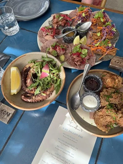 Acre Resort describes itself as a cosmopolitan gastrobar for refined meals. Although only 12 minutes from San Jose del Cabo, the 4-mile drive features several roundabouts and a deeply rutted dusty dirt road. Upon arrival, the scene is dramatically upscaled with winding smooth concrete paths bordered by native vegetation, expansive outdoor dining areas, and extensive menu items.