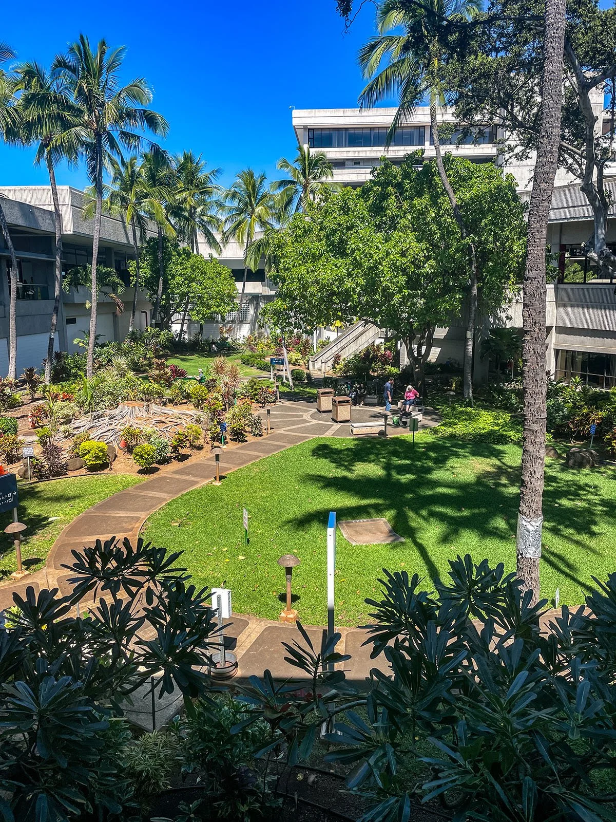 Our Airbnb was a block off Waikiki’s iconic strip, Kalakaua Avenue. Sandwiched between two hostels and behind a hotel, the view wasn’t great, but free gated parking was a selling point. Plus, it was a short walk to the beach, the popular Barefoot Cafe, and the 300 acre Kapiolani Park, home to the Honolulu Zoo, play fields, tennis courts and more.