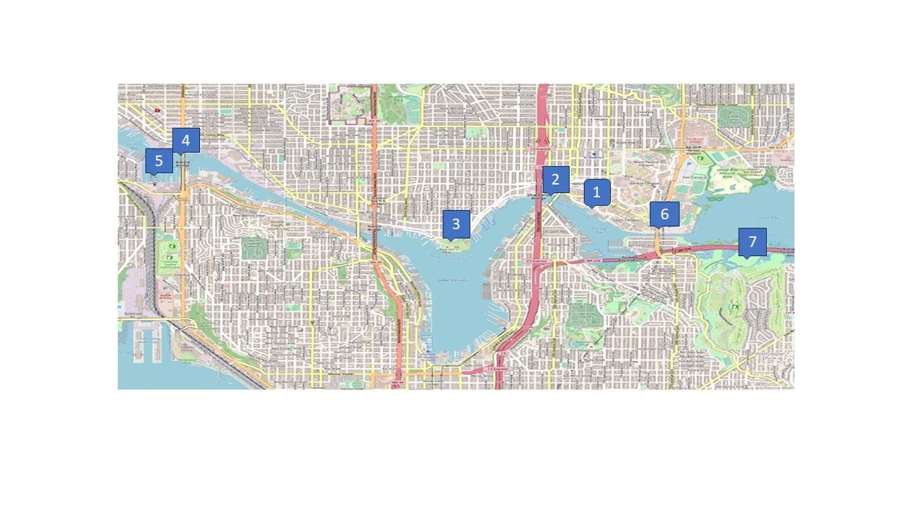 Given more time, my kayaking journey could have continued west past Gasworks Park (3) and under the Ballard Bridge (4) to Fisherman’s Terminal (5), or east under the Montlake Bridge (6) to the placid waters of the Washington Park Arboretum (7).